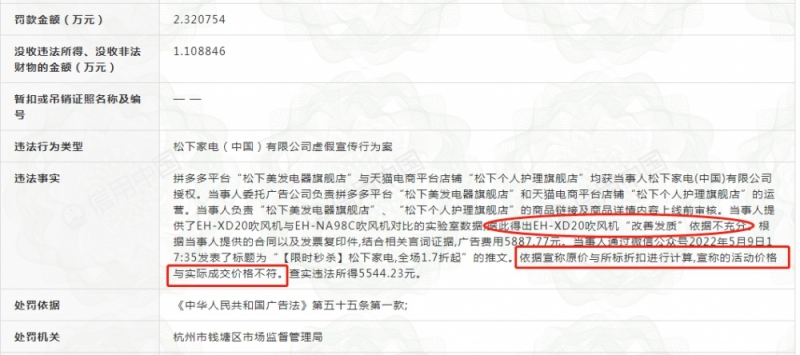 - 信用中國(guó)網(wǎng)站顯示,松下家電(中國(guó))有限公司虛假宣傳被罰款2.32萬(wàn)元,沒(méi)收違法所得1.11萬(wàn)元。截圖來(lái)源:信用中國(guó)網(wǎng)站 行政處罰決定書(shū)顯示,拼多多平臺(tái)“松下美發(fā)電
