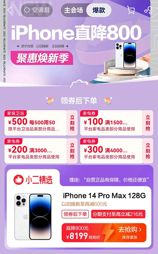 - 3月13日晚八點,蘇寧易購315“全民煥新節”正式邁入爆發節奏。iPhone、華為Mate 50、索尼、海爾、美的等千款高頻爆品參與百億補貼;家裝、百貨、母嬰、生