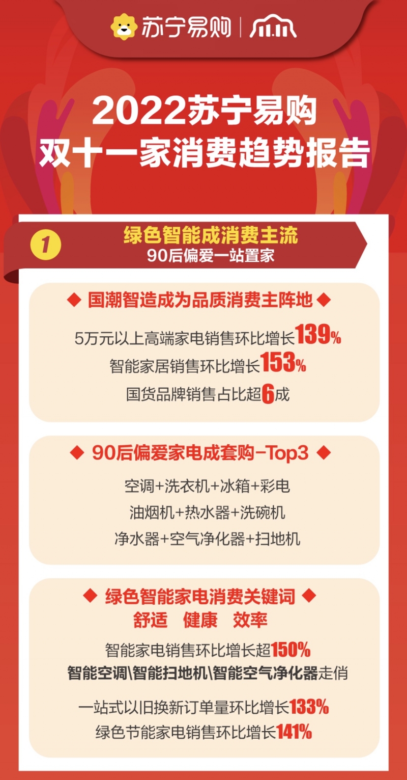 - 11月11日,蘇寧易購發(fā)布《2022雙十一家消費(fèi)趨勢報告》顯示,今年雙十一蘇寧易購發(fā)力“一站式家庭場景解決方案”,家電、家裝消費(fèi)主場優(yōu)勢持續(xù)鞏固,線下綠色節(jié)