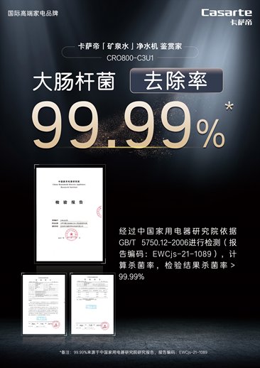 同時,這款凈水機還實現了0添加果蔬洗,有效殺菌去農殘,讓用戶吃得更健康。生活中,時有食物農藥殘留、餐具滋生細菌等狀況,威脅著家人健康,讓兒童抵抗力變差,孕婦體質下降,老人身體機能減弱。而卡薩帝「礦泉水」凈水機·鑒賞家搭載了雙極鈦鉑凈化系統,以活性氧納米超微泡、羥基離子全域凈化科技兩大技術達到雙重殺菌、凈化殘留的效果,實現大腸桿菌去除率99.99%,守護用戶的健康生活。