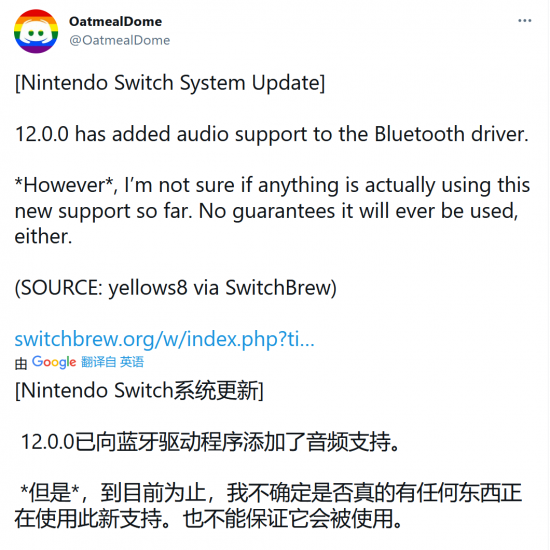 此外,OatmealDome還發(fā)現(xiàn)了12.0.0固件增加了對(duì)于藍(lán)牙音頻的支持,或許SwitchPro也將支持藍(lán)牙耳機(jī)等設(shè)備,彌補(bǔ)此前版本主機(jī)不支持藍(lán)牙耳機(jī)的遺憾。