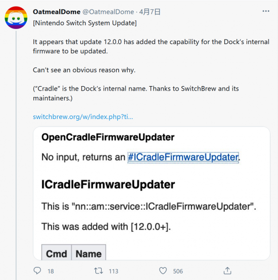 然而經(jīng)過(guò)推特網(wǎng)友OatmealDome對(duì)升級(jí)包的數(shù)據(jù)挖掘,12.0.0固件除了任天堂官方公布的bug修正功能外,還增加了對(duì)底座的固件升級(jí)功能。