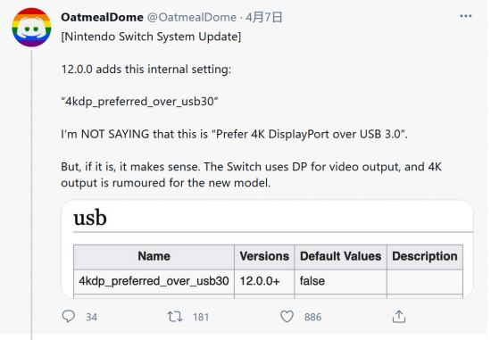 12.0.0版本固件中存在兩行設(shè)置參數(shù):“is_crda_fw_update_supported”和“4kdp_preferred_over_usb30”。 OatmealDome表示,“crda”就是“Cradle Aula”,而“Aula”則是任天堂新版底座的代號(hào)。第二行參數(shù)則表示switch將可以通過(guò)USB3.0(可能指Type-C)輸出4KDP協(xié)議信號(hào)。