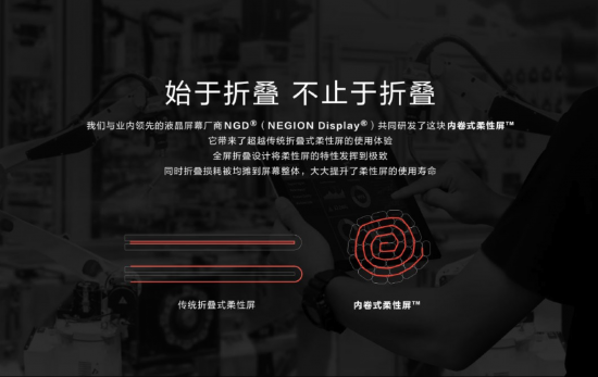 聯想表示這塊內卷式柔性屏是與液晶廠商共同研發的,除了可以大大提升柔性屏的使用壽命,還可以延展出“內卷形態”“臂帶形態”等多種造型與場景,同時搭載了人體傳感器與“現實扭曲矯正力場發生器”,用戶在各種角度翻折或內卷的狀態下,都可以正常使用電腦,即使在床上也可以高效回復老板的信息。