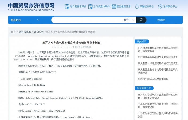土耳其對華燃氣熱水器啟動反傾銷日落復審調(diào)查