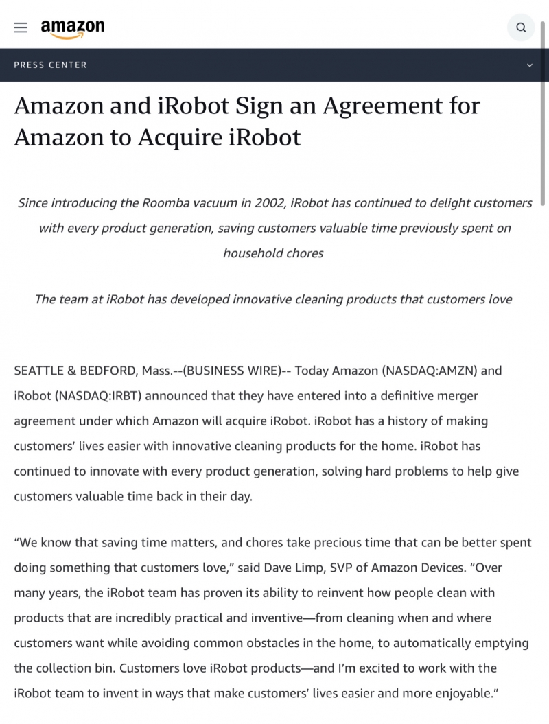 - 亞馬遜在去年逐步表現出對于掃地機器人公司 iRobot 的濃厚興趣,并在今年初提議將以每股 61 美元,總價約 17 億美元(當前約 122.91 億元人民幣)的價格收購 iRobot 公司,目前這一收購決定正