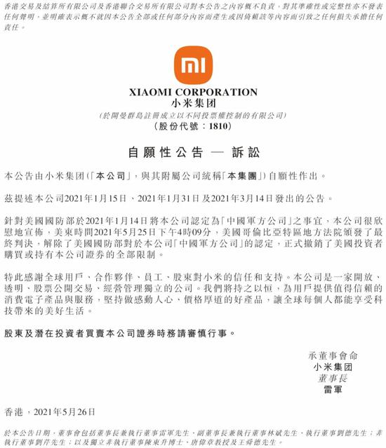 - 小米集團港交所公告顯示,美東時間5月25日下午4時09分,美國哥倫比亞特區地方法院頒發了最終判決,解除了美國國防部對于本公司“中國軍方公司”的認定,正式撤銷了美國投資者購