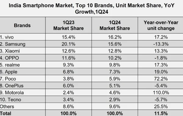 - 近日,CNMO注意到,有調研機構公布了印度前十大智能手機品牌的最新市場數據。不少網友發現,其中居然有八家屬于中國企業。 據調研數據,2024年第一季度印度前十大智能手機品牌和它們的市場
