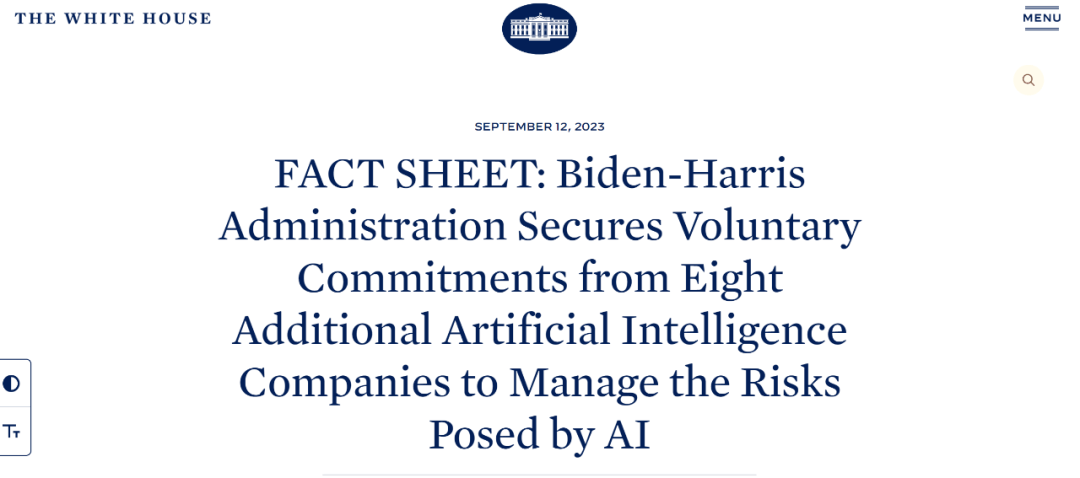 - 9月12日,美國白宮發(fā)布聲明稱,美國商務(wù)部長雷蒙多等政府高官將在白宮召集人工智能(AI)行業(yè)高管,宣布Adobe、Cohere、IBM、英偉達(dá)、Palantir、Salesforce、Scale AI和 Stability八家公司承諾