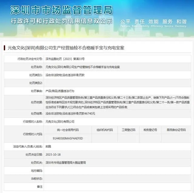 - 近日,深圳市市場監督管理局大鵬監管局發布行政處罰信息(深市監鵬處罰〔2023〕葵涌33號),涉及元兔文化(深圳)有限公司生產經營抽檢不合格暖手寶與充電寶案。
