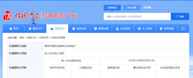 - 近日,信用中國(廣東)網(wǎng)站公開行政處罰信息(行政處罰決定書文號:安市監(jiān)金石處字〔2023〕4號),涉及潮州市潮安區(qū)南希五金制品廠。 經(jīng)查,潮州市潮安區(qū)南希五金制品廠于2022年2月生產(chǎn)一批次