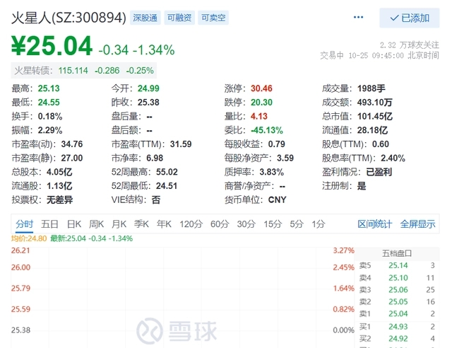 - 10月25日,截至9:45,火星人(300894.SZ)跌1.34%,報25.04元,總市值為101.45億元。 10月24日,火星人發布2022年第三季度報告,公司實現營業收入16.42億元,同比增長2.72%;歸屬于上市公司股東的凈