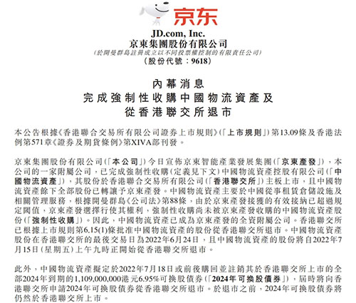 - IT之家 7 月 14 日消息,京東集團(tuán)今日在港交所發(fā)布公告,京東集團(tuán)股份有限公司(「本公司」)今日宣布京東智能產(chǎn)業(yè)發(fā)展集團(tuán)(「京東產(chǎn)發(fā)」),本公司的一家附屬公司,已完成強(qiáng)制性收購中國物流資產(chǎn)