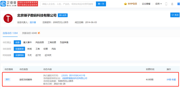 - 近日,北京錘子數碼科技有限公司新增股權解凍信息,股權凍結詳情顯示,股權數額為5000萬元人民幣,被執行人為北京錘子數碼科技有限公司,凍結股權標的企業成都野望數碼科技有限公司,案由涉服務合