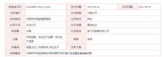 - 無錫市市場監(jiān)管局發(fā)布家用燃?xì)鉄崴鳟a(chǎn)品質(zhì)量監(jiān)督抽查結(jié)果