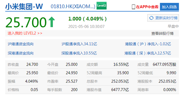 - 5月6日上午消息,港股開盤后小米集團漲近5%,截至10:30,小米漲4%報25.7港元,市值達6477.77億港元,成交額16.559億港元。 早些時候,小米集團董事長兼CEO雷軍在微博表示,今年第一季度歐洲