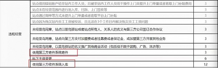 《菜鳥驛站合作協議》顯示,使用第三方系統寄件及入庫都屬于違規經營。