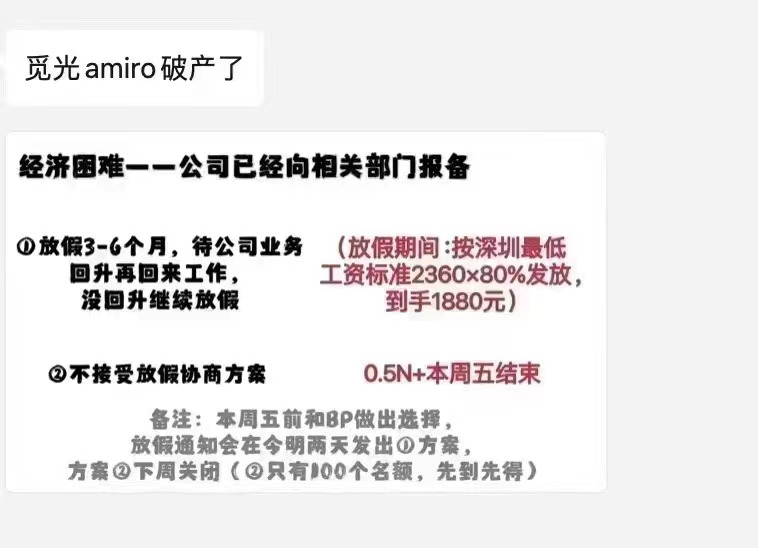 【劃重點】: 近日網上有傳言稱,頭部家用美容儀品牌AMIRO覓光忽然宣布公司大裁員,有2個方案供被裁員工選擇,其一是直接休3-6個月,工資發深圳最低標準2360*0.8,到手1880元;其二是接受0.5N的賠償,必須在下周