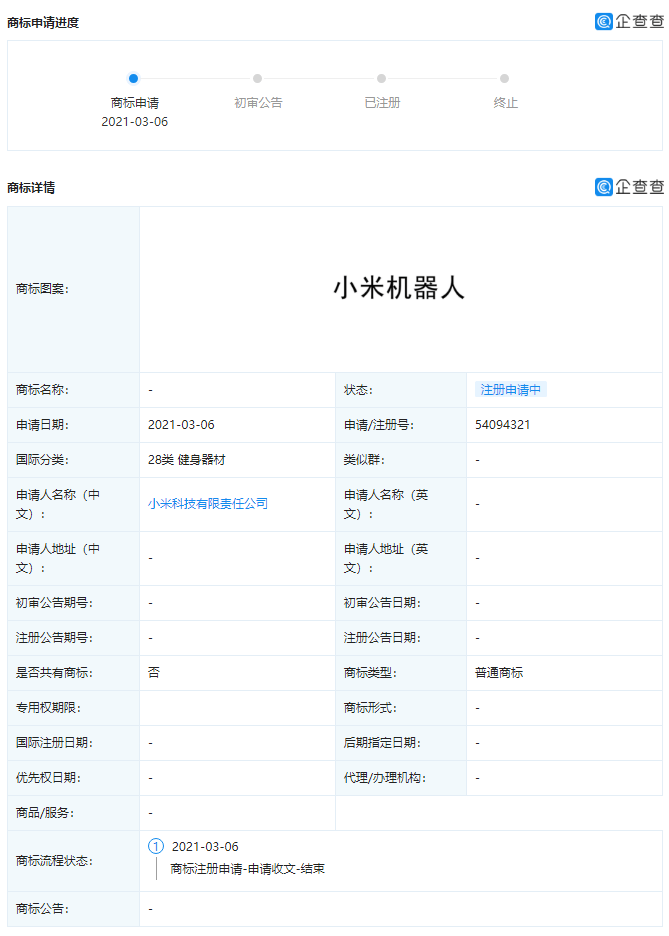 【劃重點】: 企查查APP顯示,3月6日,小米科技有限責任公司新增“小米機器人”商標申請信息,國際分類為健身器材,目前商標狀態為“注冊申請中”。