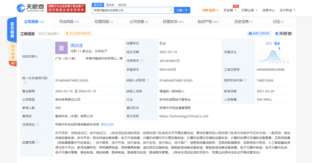 【家電資訊-家電新聞 - 上市企業,作者:編輯】4月1日上午消息,天眼查App顯示,3月29日,珠海市魅族科技有限公司發生多項工商變更,黃秀章退出法定代表人職位,由黃質潘接任。同時,經營范圍新增“虛擬現實設備制造;智能家庭消費設備制造;電子元器件制造”等。珠海市魅族科技有限公司成立于2003年3月14日,注冊資本約3.8億。