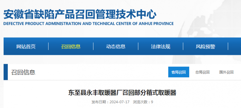 - 【安徽】?東至縣永豐取暖器廠召回部分箱式取暖器