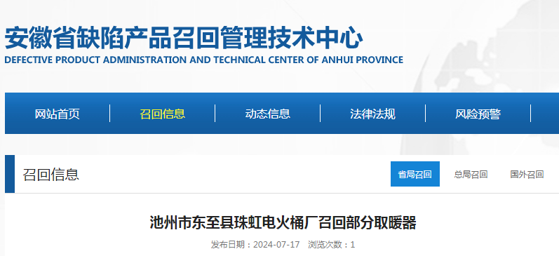 - 【安徽】池州市東至縣珠虹電火桶廠召回部分取暖器
