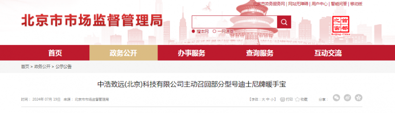 - 中浩致遠(yuǎn)(北京)科技有限公司主動(dòng)召回部分型號(hào)迪士尼牌暖手寶 中浩致遠(yuǎn)(北京)科技有限公司按照《消費(fèi)品召回管理暫行規(guī)定》的要求,向北京市市場(chǎng)監(jiān)督管理局報(bào)告了召回計(jì)劃,主動(dòng)召回2023年10