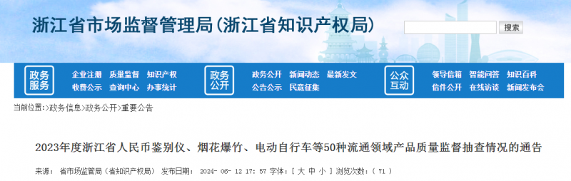 - 2024年6月12日,浙江省市場監(jiān)督管理局網(wǎng)站發(fā)布2023年度浙江省人民幣鑒別儀、煙花爆竹、房間空氣調(diào)節(jié)器、電動(dòng)自行車等50種流通領(lǐng)域產(chǎn)品質(zhì)量監(jiān)督抽查情況的通告。 本次抽查了77批次房間