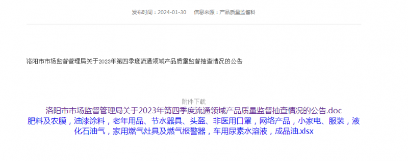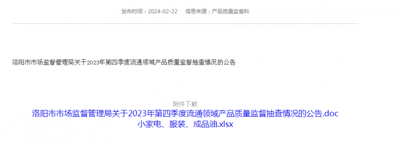 - 根據《洛陽市市場監督管理局關于下達<2023年洛陽市產品質量監督抽查計劃>的通知》(洛市監〔2023〕2號)的通知要求,河南省洛陽市市場監督管理局2023年在全市組織開展了流通領域小家電、服