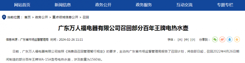 - 日前,廣東萬人福電器有限公司按照《消費品召回管理暫行規定》的要求,主動向廣東省市場監督管理局報告了召回計劃,將自即日起,召回2022年4月26日期間制造的部分百年王牌WA-15A型號電熱水壺,涉