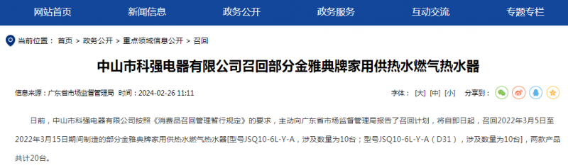 - 中山市科強電器有限公司召回部分金雅典牌家用供熱水燃氣熱水器