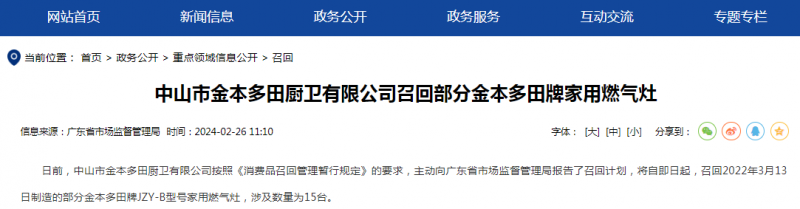 - 日前,中山市金本多田廚衛有限公司按照《消費品召回管理暫行規定》的要求,主動向廣東省市場監督管理局報告了召回計劃,將自即日起,召回2022年3月13日制造的部分金本多田牌JZY-B型號家用燃氣