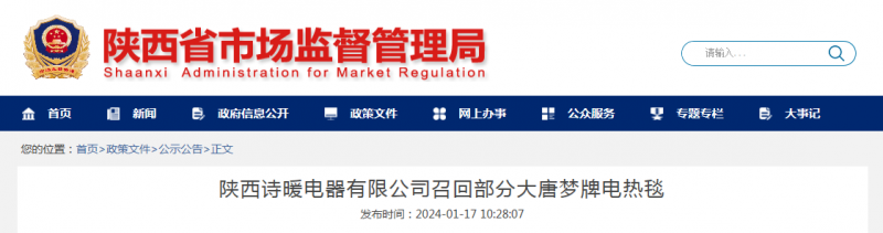 - 陜西詩暖電器有限公司召回部分大唐夢牌電熱毯