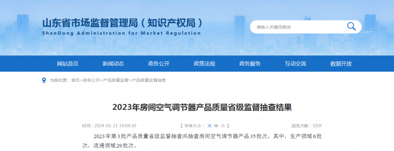 - 【山東】2023年房間空氣調節器產品質量省級監督抽查結果