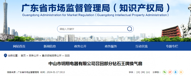 - 中山市玥翔電器有限公司召回部分鉆石王牌換氣扇