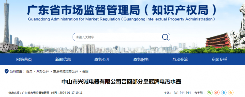 - 日前,中山市興誠電器有限公司按照《消費品召回管理暫行規定》的要求,主動向廣東省市場監督管理局報告了召回計劃,將自即日起,召回2022年5月5日期間制造的部分皇冠牌XC-18B2型號電熱水壺,涉及