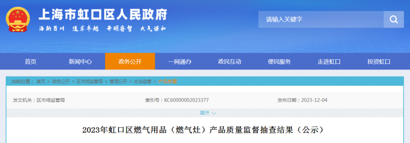 - 2023年上海市虹口區燃氣用品(燃氣灶)產品質量監督抽查結果