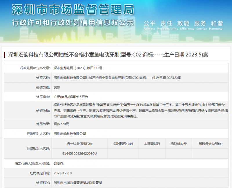 - 深圳宏韻科技有限公司抽檢不合格小章魚電動牙刷案