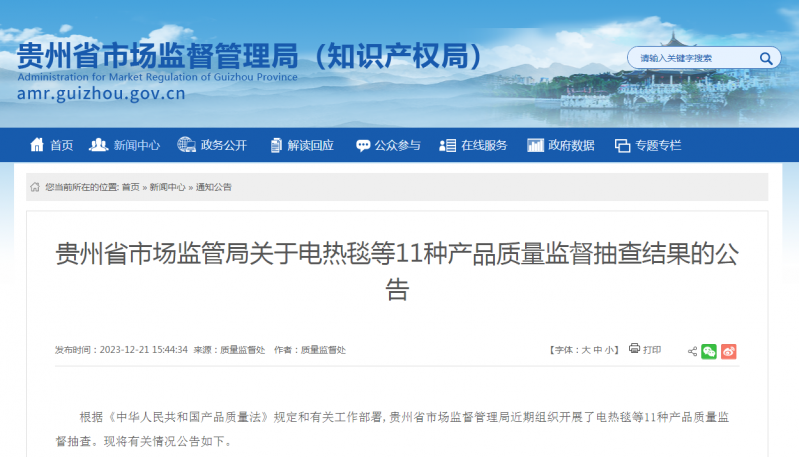 - 貴州省市場監管局關于電熱毯等11種產品質量監督抽查結果的公告