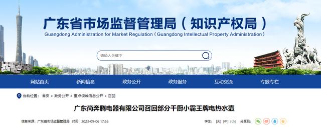 - 據(jù)廣東省市場監(jiān)督管理局網(wǎng)站2023年9月6日消息,日前,廣東尚奔騰電器有限公司按照《消費品召回管理暫行規(guī)定》的要求,主動向廣東省市場監(jiān)督管理局報告了召回計劃,將自即日起,召回2021年3月6日