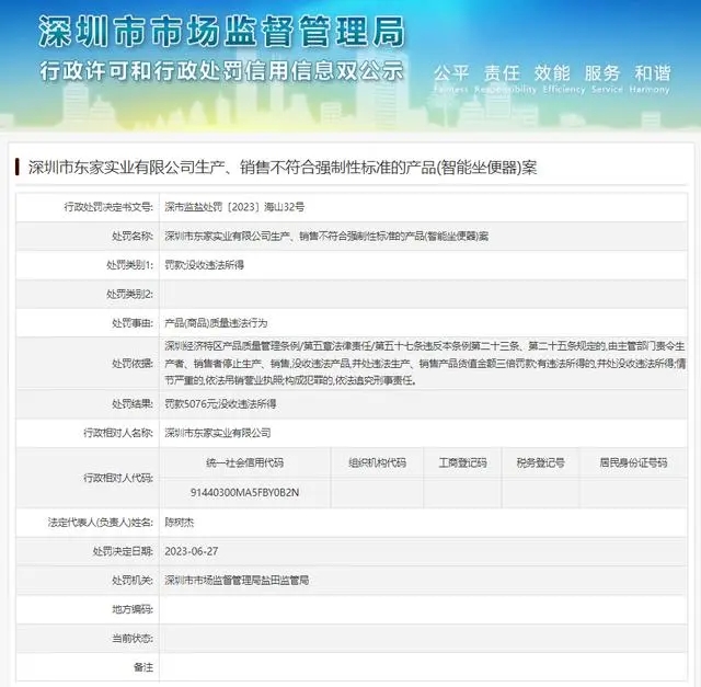- 深圳市東家實業有限公司生產、銷售不符合強制性標準的產品(智能坐便器)案