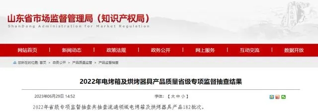- 2023年6月29日,山東省市場監督管理局網站公布2022年電烤箱及烘烤器具產品質量省級專項監督抽查結果,共抽查流通領域電烤箱及烘烤器具產品182批次,發現3批次產品不符合相關標準的要求,不合格項目