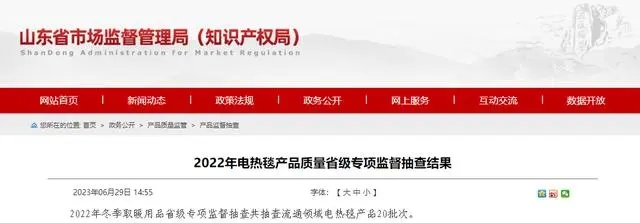 - 2023年6月29日,山東省市場監督管理局網站公布2022年電熱毯產品質量省級專項監督抽查結果。 信息顯示,2022年冬季取暖用品省級專項監督抽查共抽查流通領域電熱毯產品20批次。抽查發現9