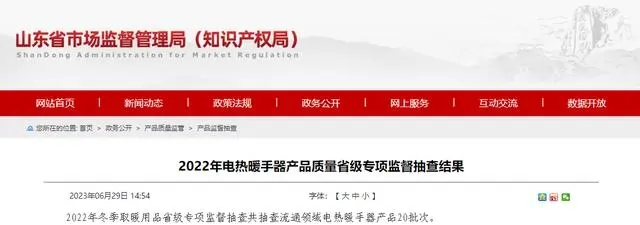 - 2023年6月29日,山東省市場監督管理局網站公布2022年電熱暖手器產品質量省級專項監督抽查結果。 信息顯示,2022年冬季取暖用品省級專項監督抽查共抽查流通領域電熱暖手器產品20批次。發