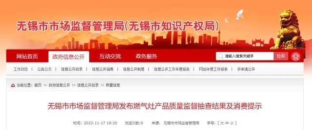 - 據江蘇省無錫市市場監督管理局網站2022年11月17日消息,2022年度,無錫市市場監督管理局對燃氣灶產品質量進行了監督抽查。共抽查產品12批次,不合格產品1批次。