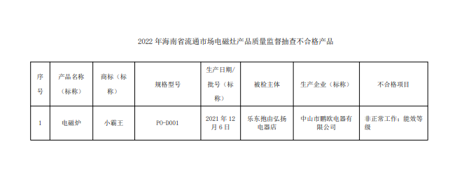 - 2022年海南省流通市場電磁灶產品質量監督抽查結果公布