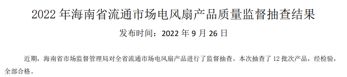 - 2022年9月26日,海南省市場監管局網站公布2022年海南省流通市場電風扇產品質量監督抽查結果。近期,海南省市場監督管理局對全省流通市場電風扇產品進行了監督抽查。本次抽查了12批次產品,經
