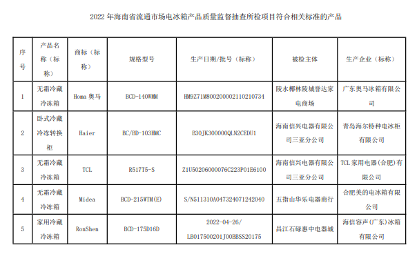 - 海南省市場監管局抽查電冰箱5批次均合格