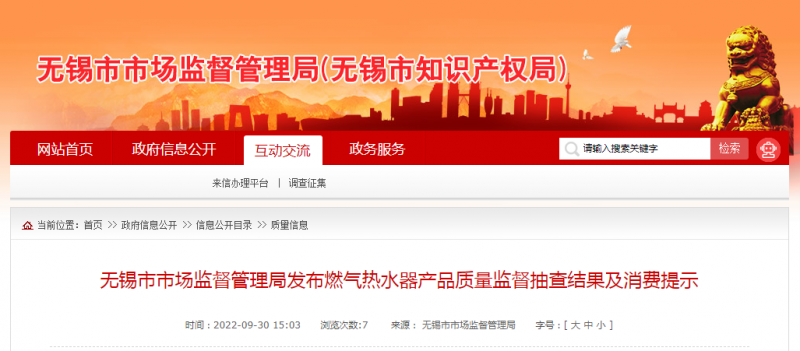 - 江蘇省無錫市市場監管局抽查15批次燃氣熱水器產品合格率100%