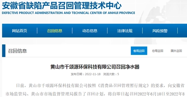 - 據安徽省缺陷產品召回管理技術中心網站11月18日消息,日前,黃山市千頌源環??萍加邢薰景凑铡断M品召回管理暫行規定》的要求,向安徽省市場監管局、黃山市市場監督管理局報告了召回計劃,